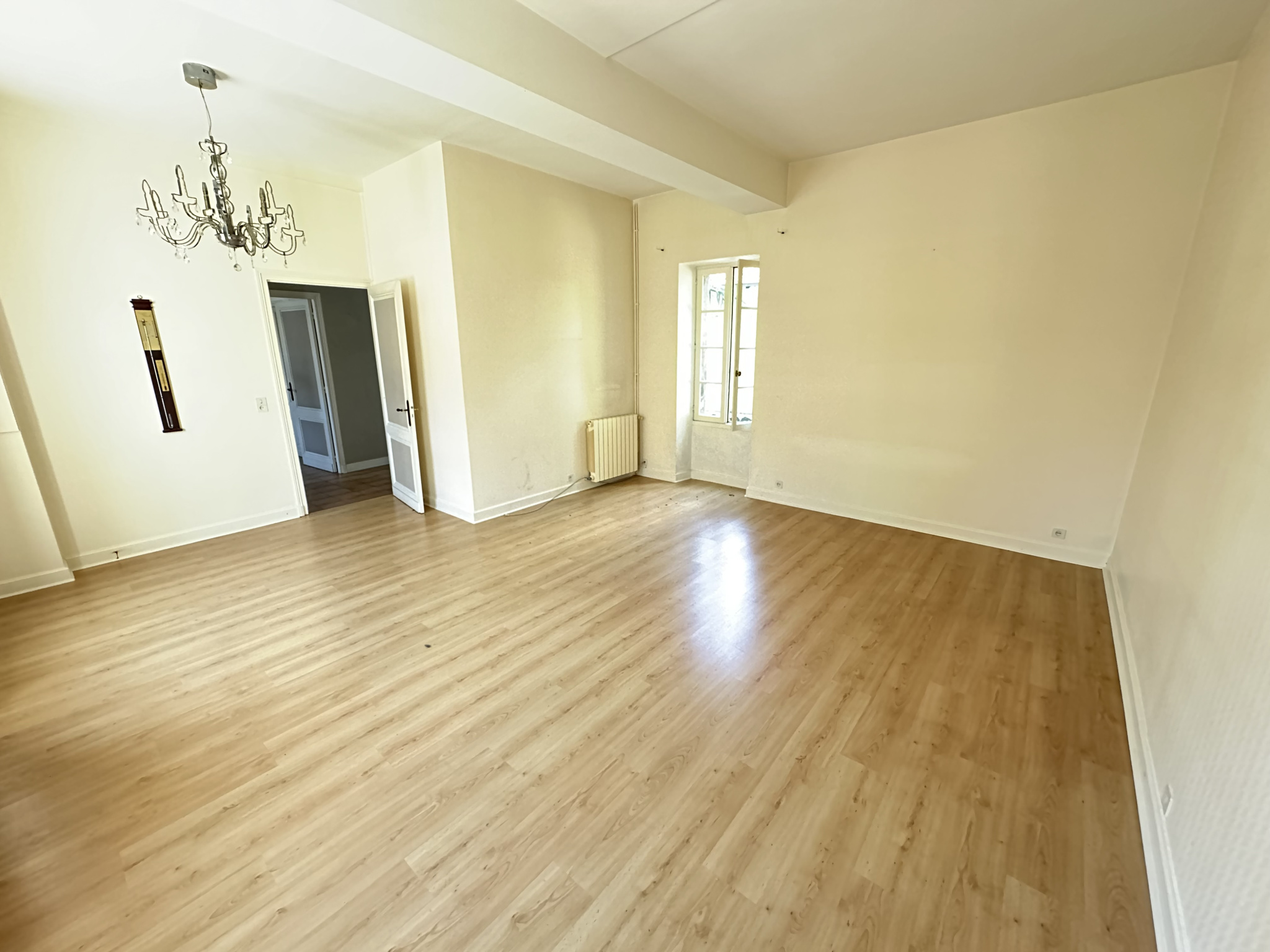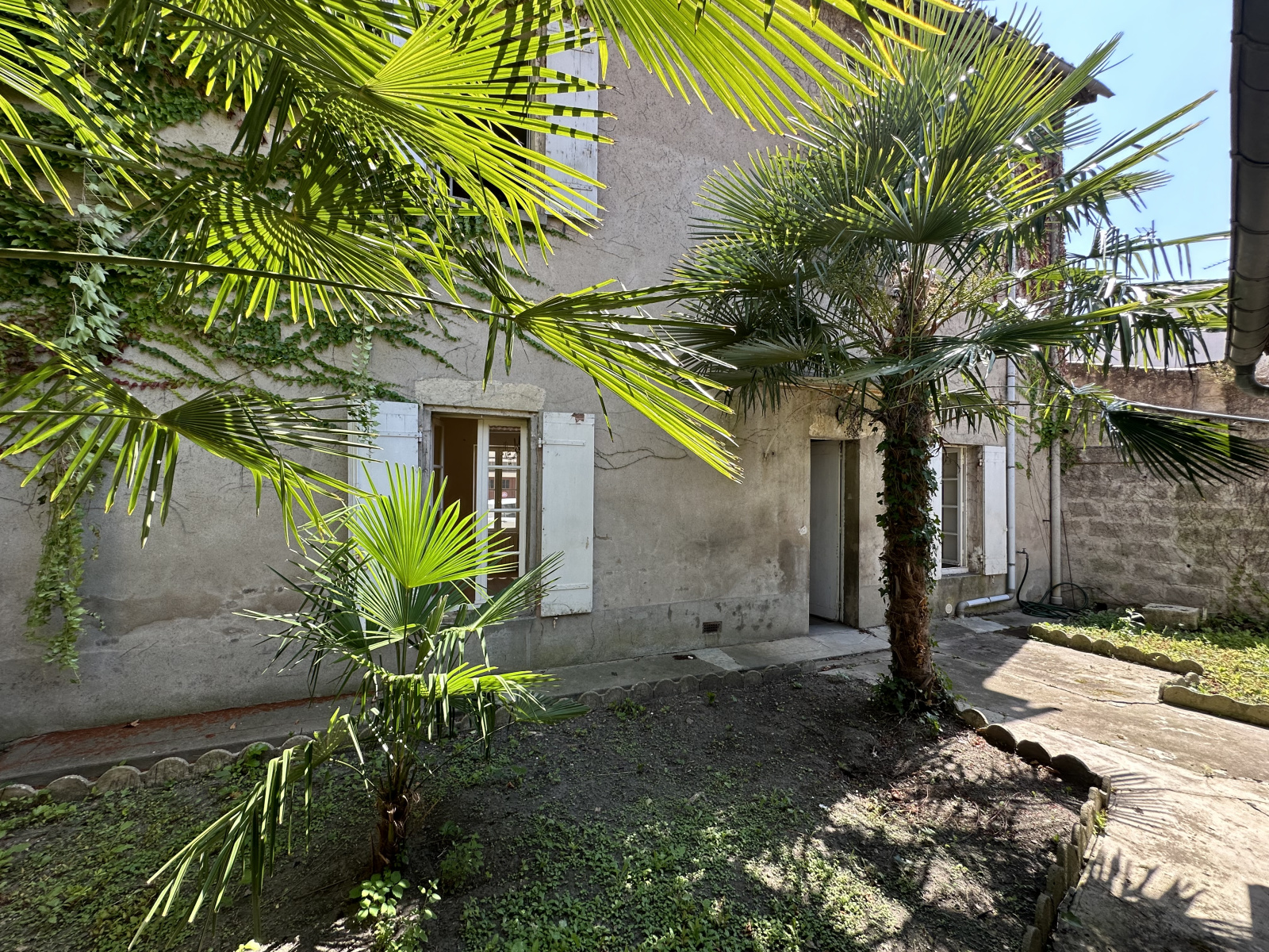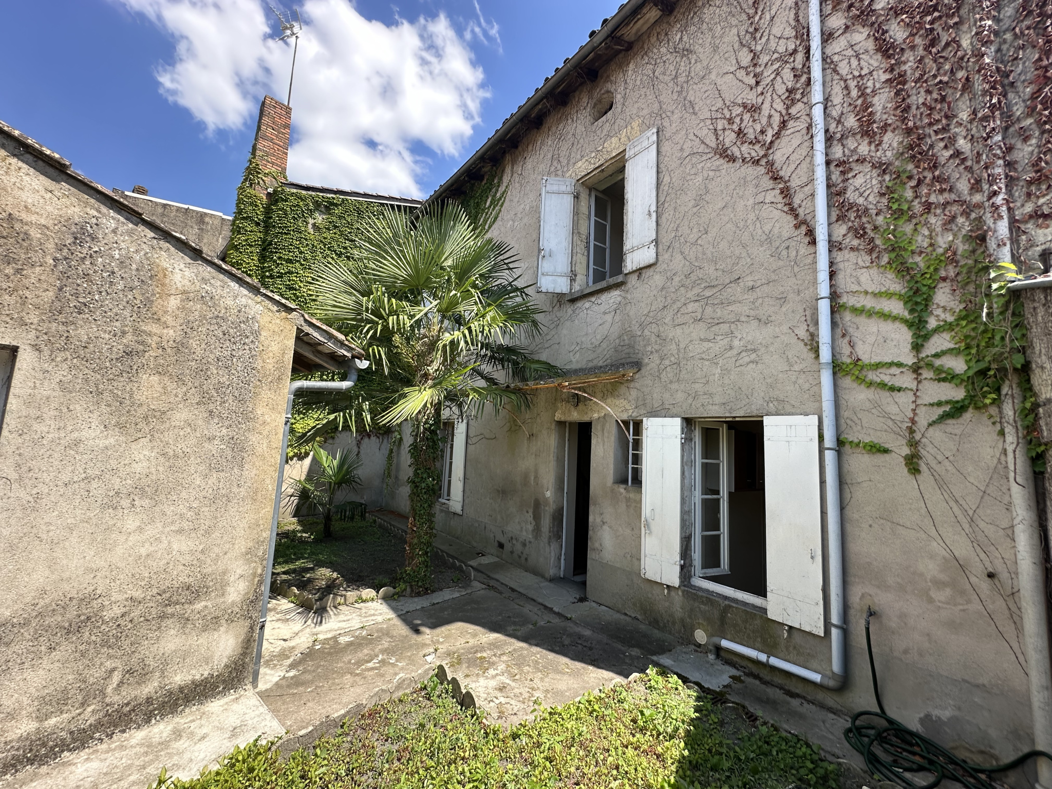 En plein centre-ville de Marmande, maison de 115 m² comprenant au rez-de-chaussée : une entrée, un dégagement, une cuisine, un salon séjour, un cellier et un WC. À l'étage : trois chambres, une salle de bains.