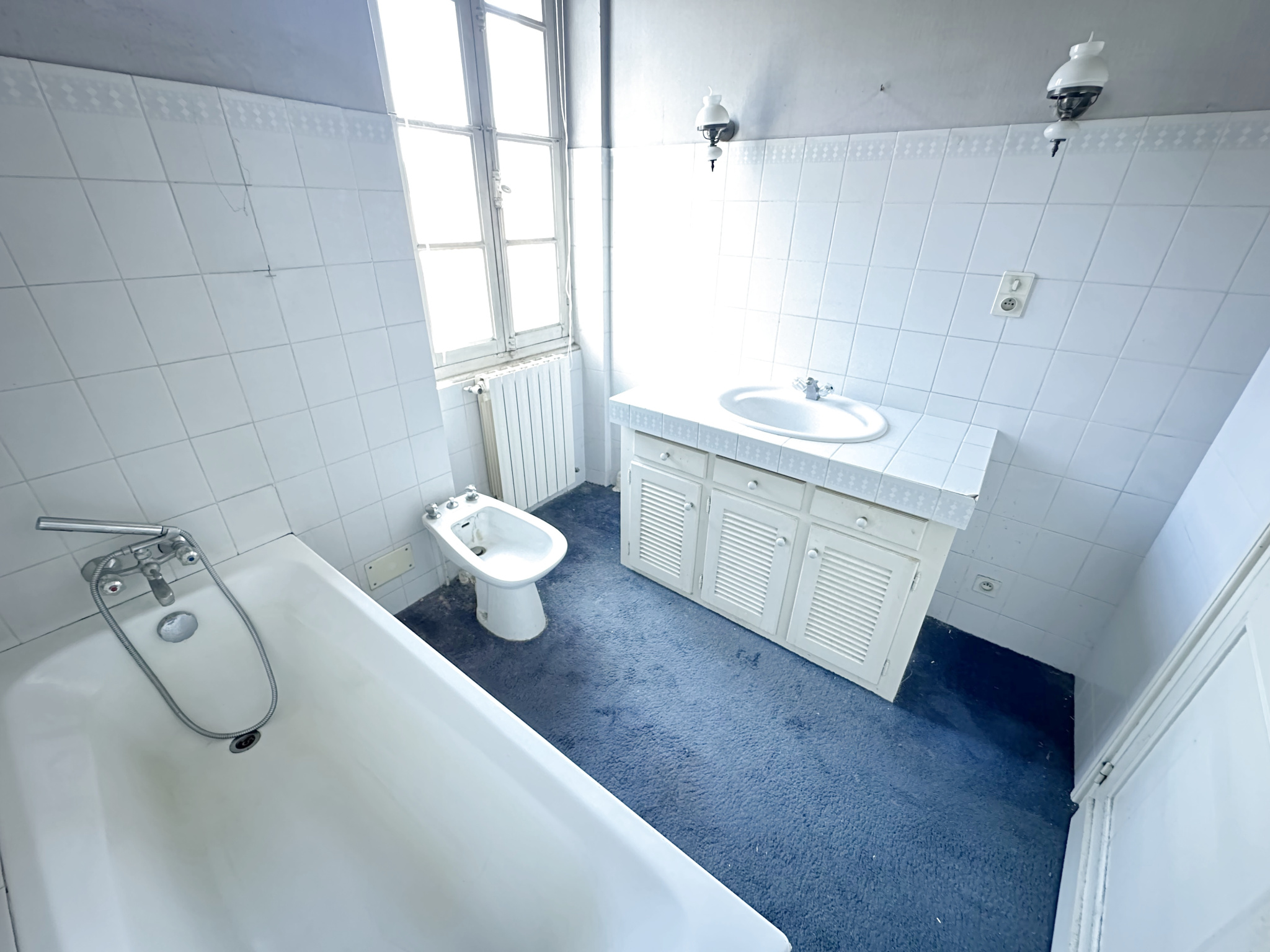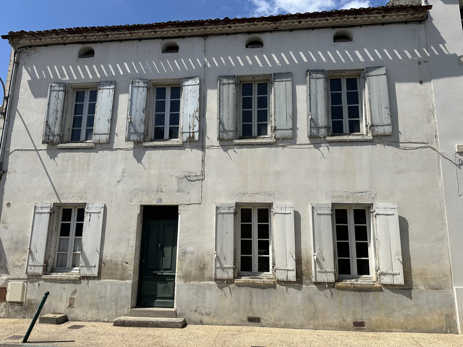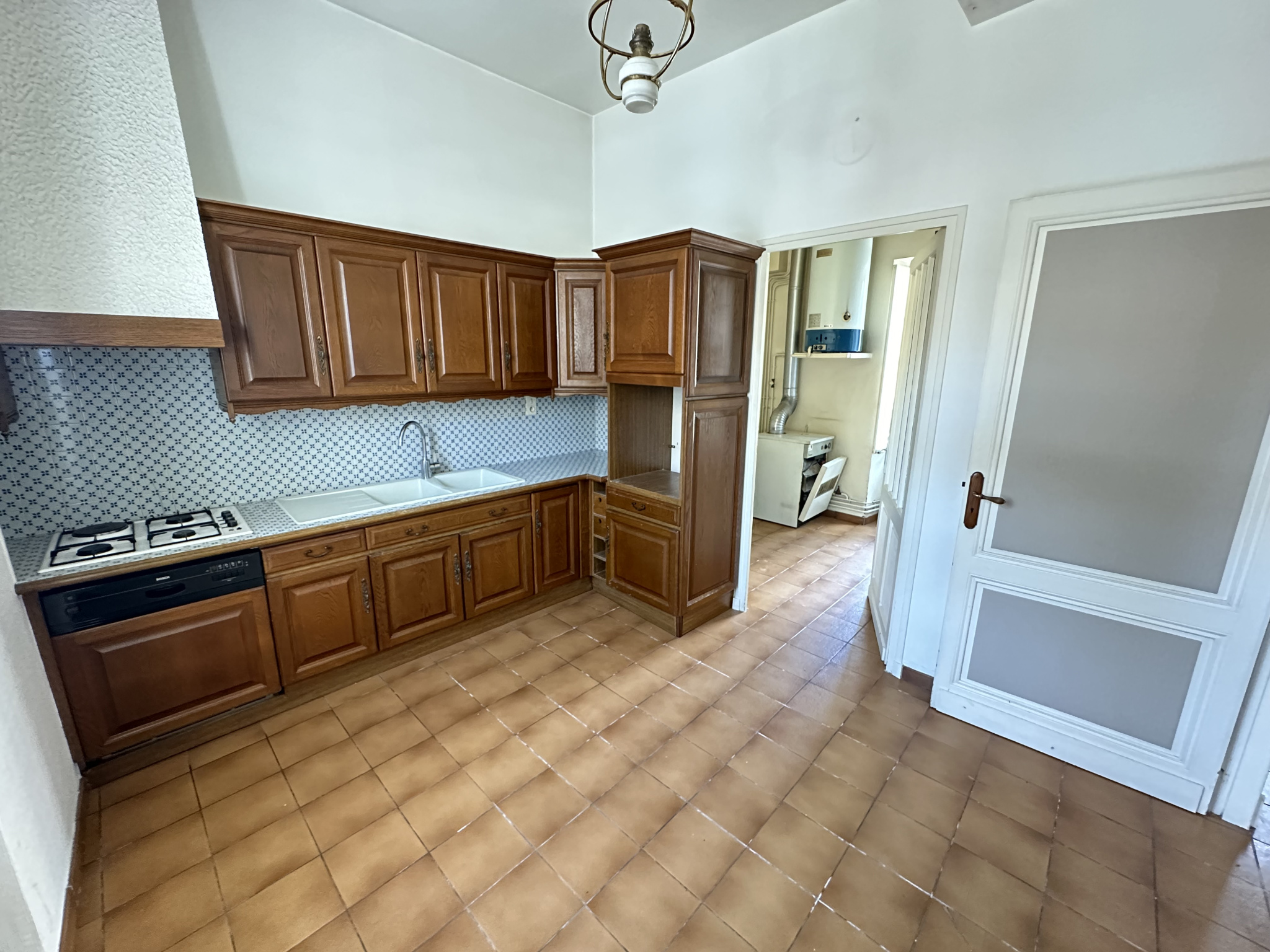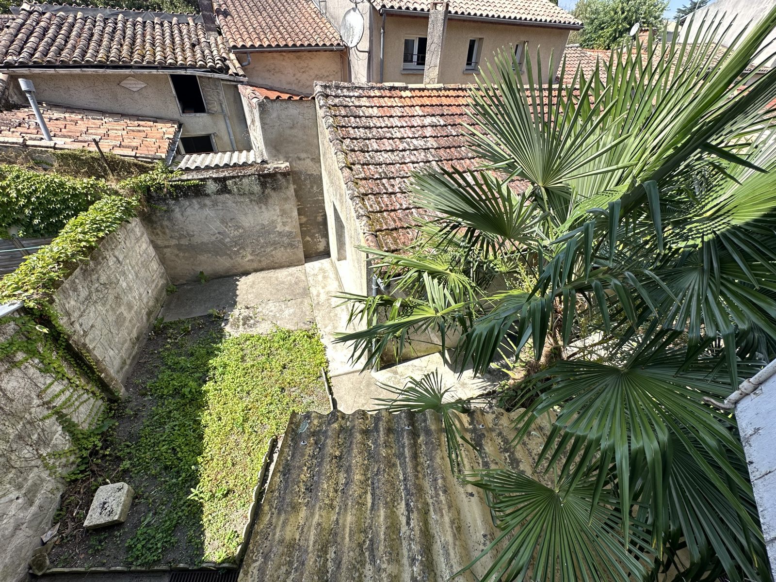 En plein centre-ville de Marmande, maison de 115 m² comprenant au rez-de-chaussée : une entrée, un dégagement, une cuisine, un salon séjour, un cellier et un WC. À l'étage : trois chambres, une salle de bains.