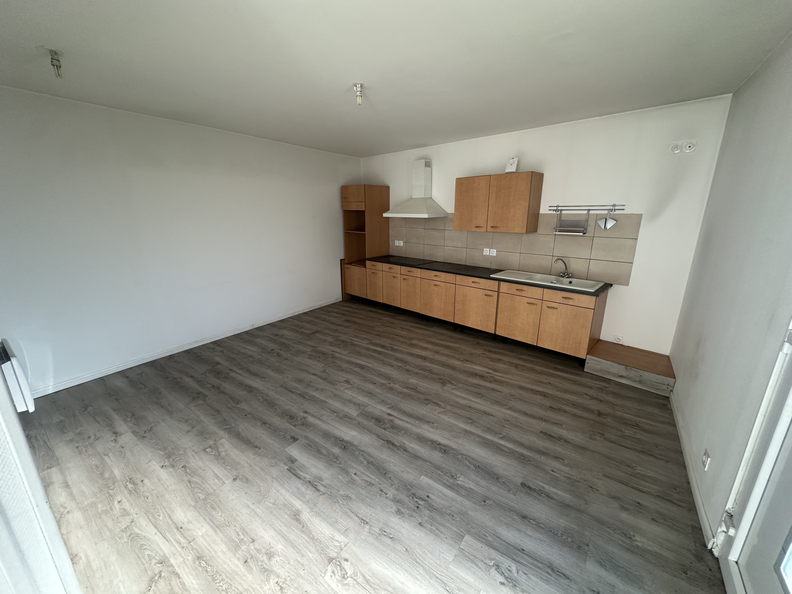 Une entrée, un salon séjour avec coin cuisine, une salle d'eau, un WC, trois chambres et un cellier