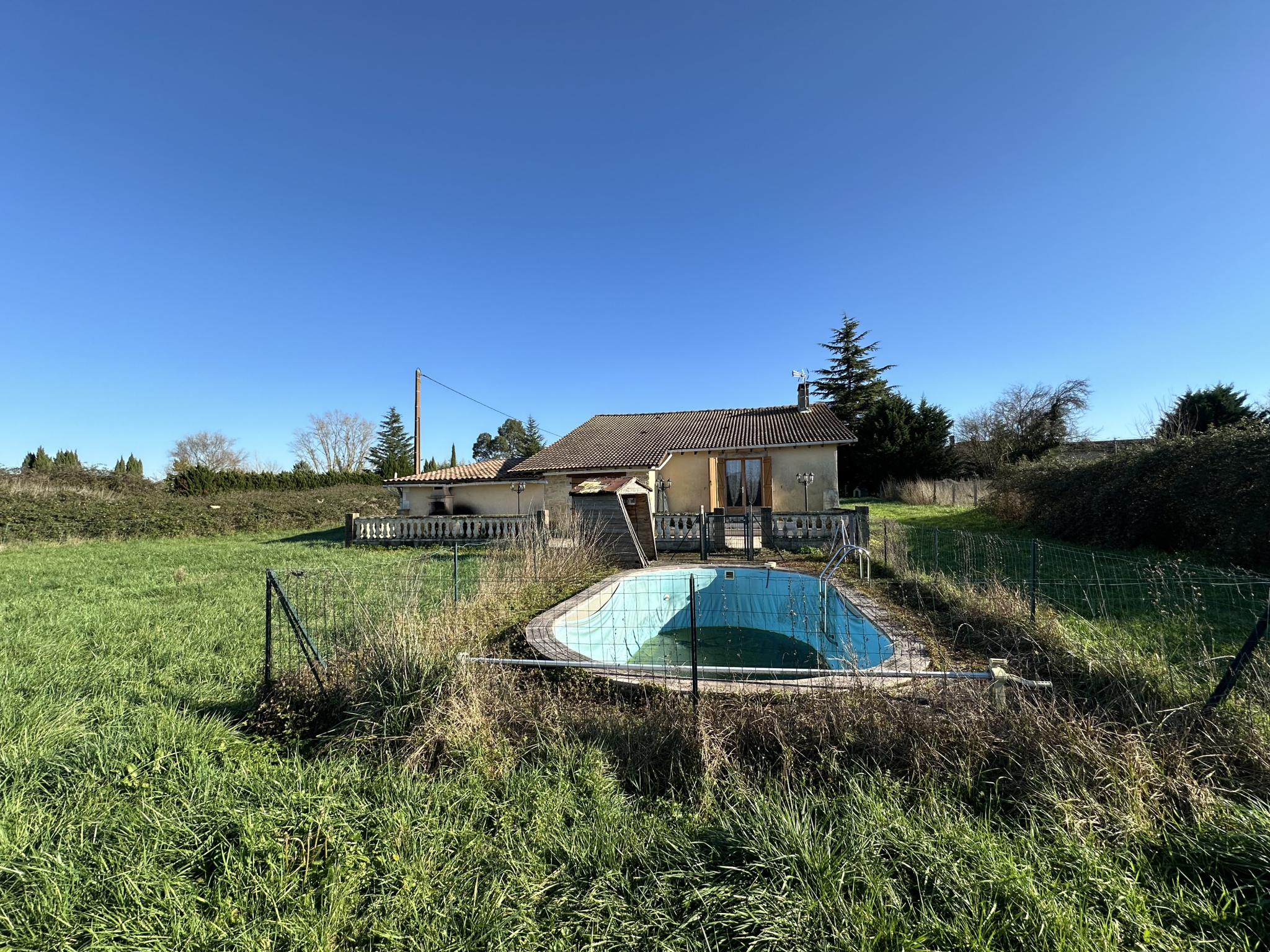 À l'extérieur, la propriété comprend un garage attenant pour un stationnement pratique. La terrasse équipée d'un barbecue est parfaite pour profiter des repas en plein air avec vue sur le paysage environnant. Une piscine à rénover offre un potentiel supplémentaire pour créer un espace de détente idyllique.