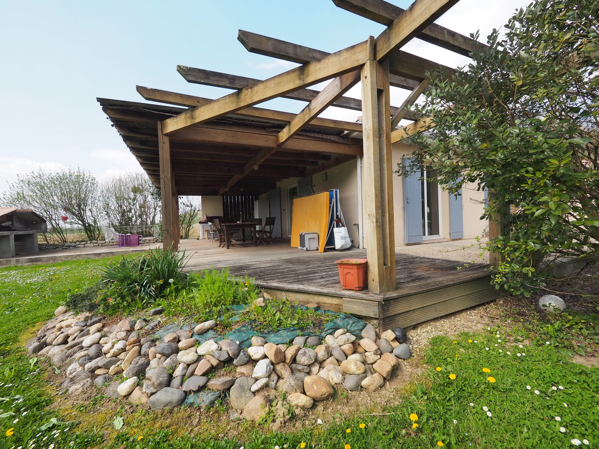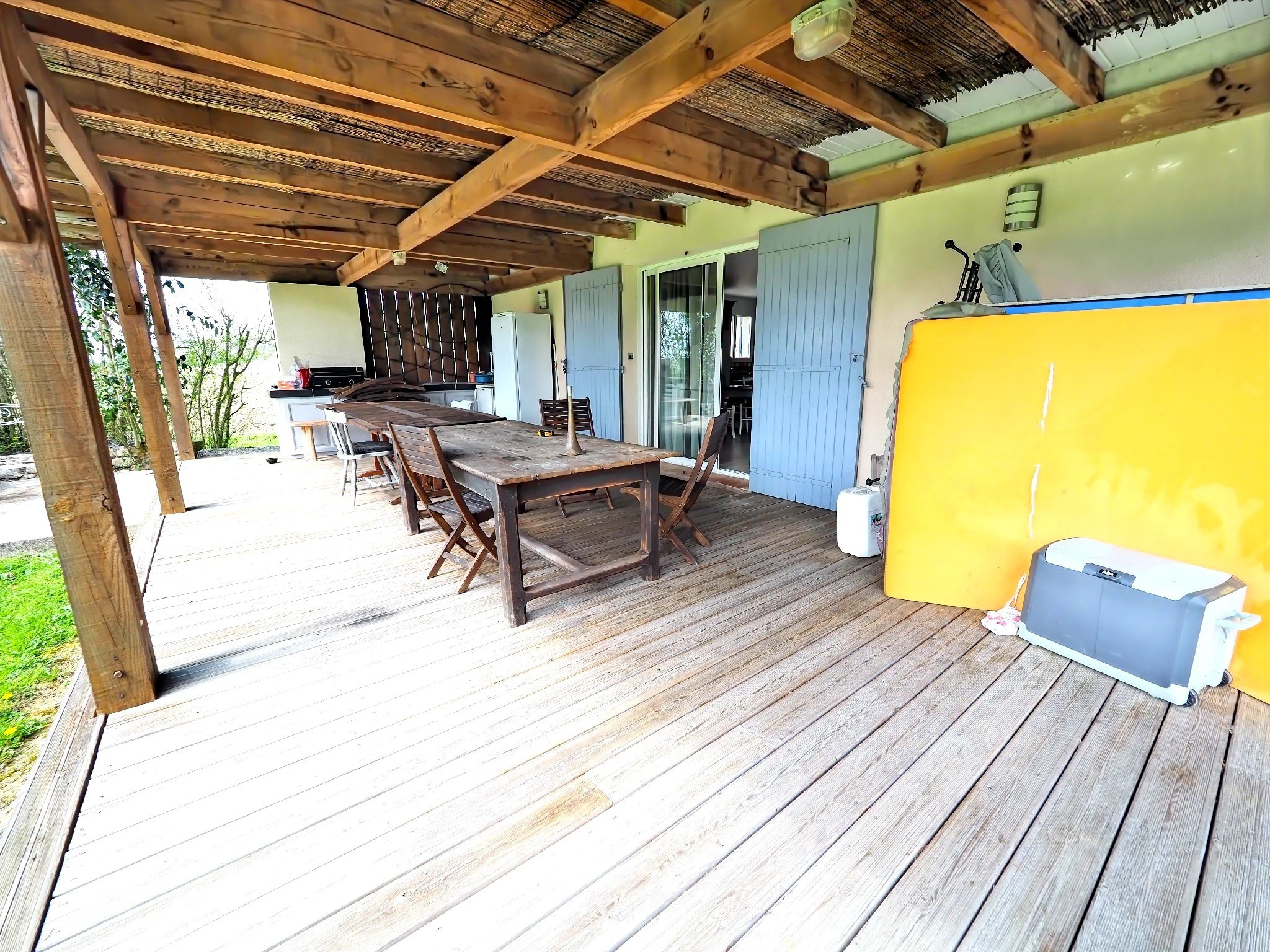 À l’extérieur, une superbe terrasse couverte permet de profiter pleinement du calme et de la vue sur un joli parc paysager, sans aucun vis-à-vis. Des panneaux solaires sont déjà installés et prêts à être branchés, offrant un vrai potentiel d’économies d’énergie.